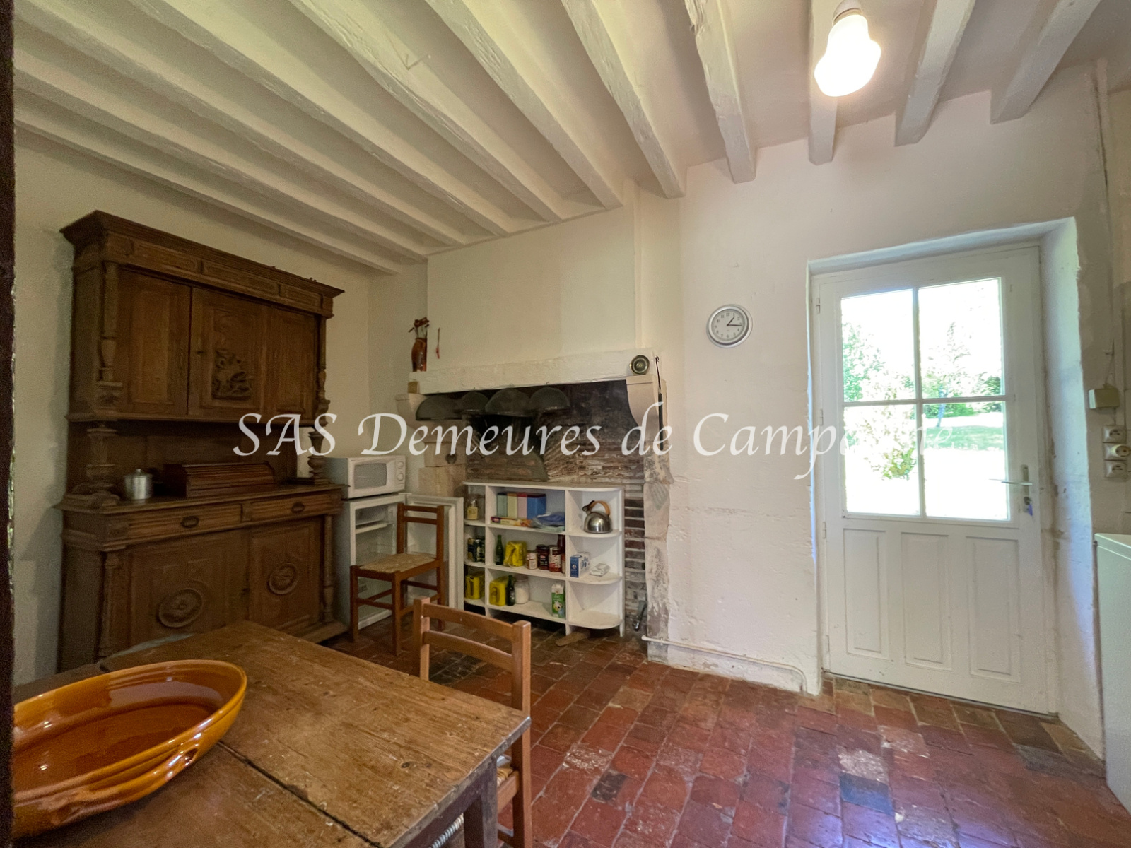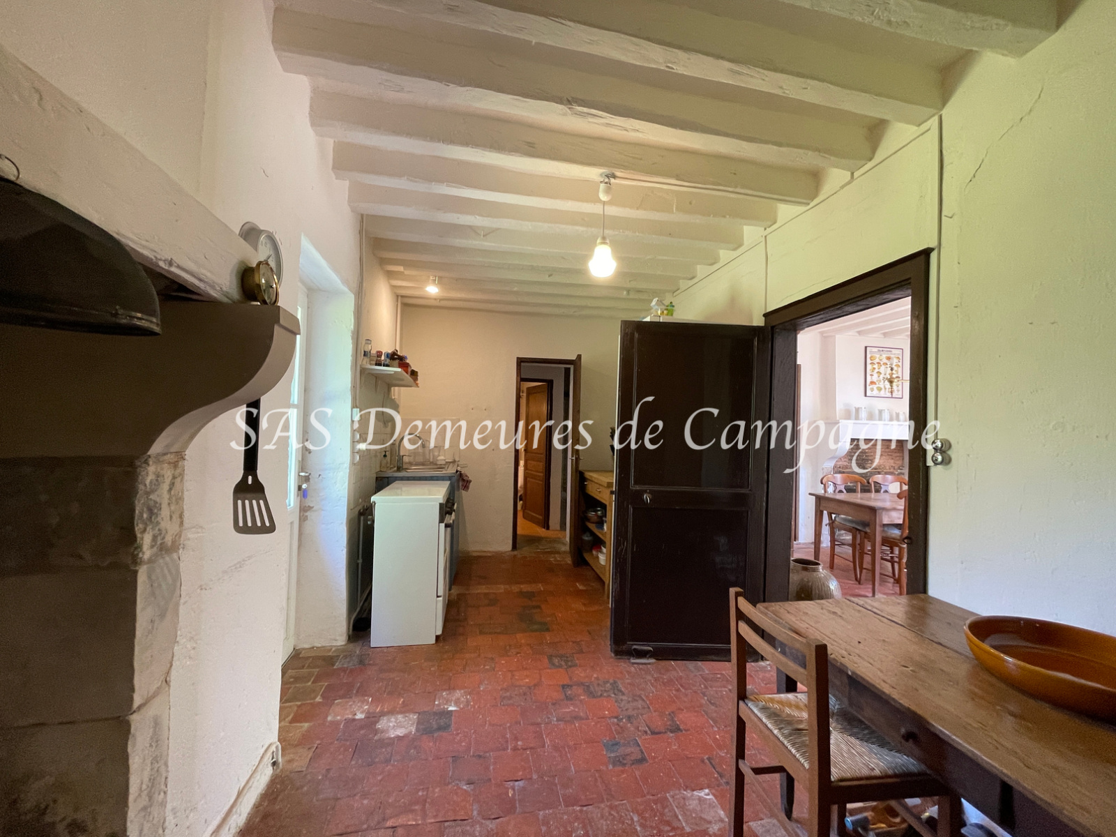 Entrée sur salle à manger avec cheminée, puis spacieux salon avec cheminée, cuisine, 2 chambres de plain-pied, salle de bains, douches et WC.
