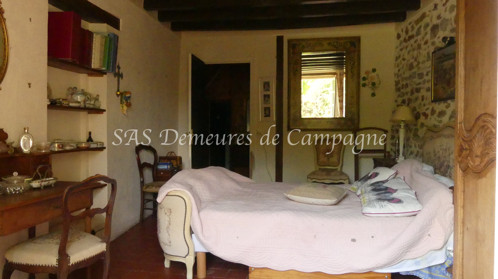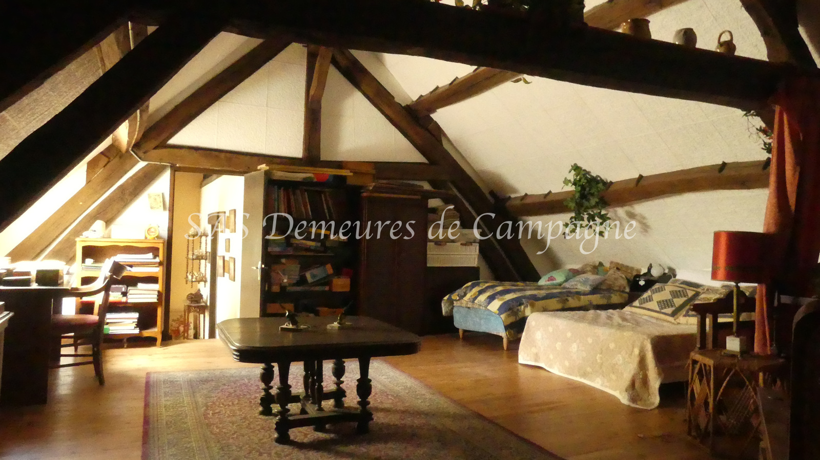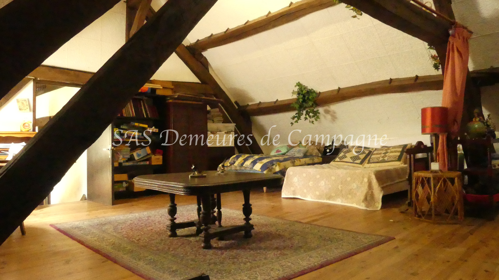- d'une fermette d'env.150m2 habitables. Le rez-de-chaussée propose : entrée sur le salon cheminée, cuisine et arrière cuisine, salle à manger. Couloir avec toilette et salle de douche séparés, une chambre de plain-pied avec vue sur le jardin. A l'étage, palier mansardé desservant une chambre et un très bel espace avec charpente apparente, actuellement à usage de dortoir. Autre pièce à rénover au premier étage. Terrasse plein sud côté jardin, clos de haies.