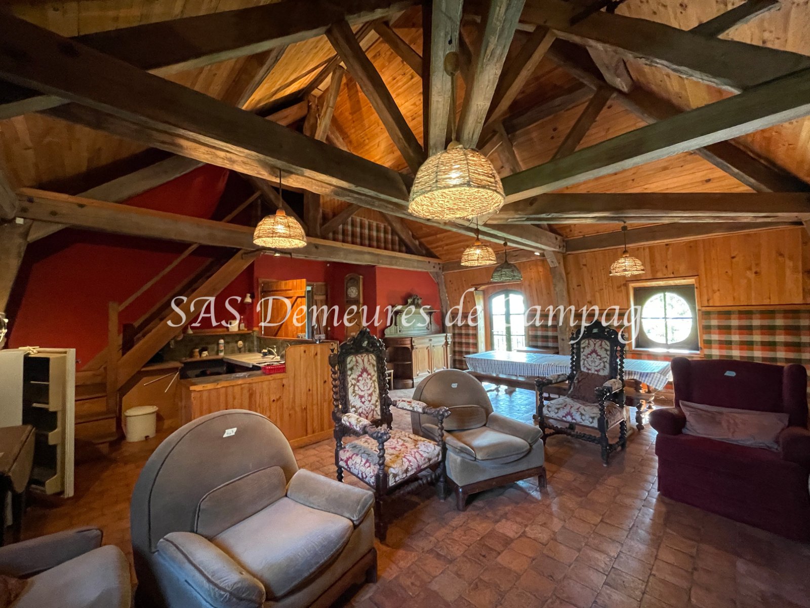 - Les Grandes Ecuries : au rez-de-chaussée, anciennes écuries, sellerie, porche et remises. A l'étage, à usage de gîte pour env. 265m2 habitables, cuisine, grand salon de près de 70m2, 9 chambres, 3 WC, 3 salles de douches.