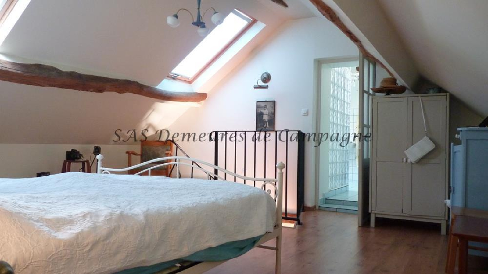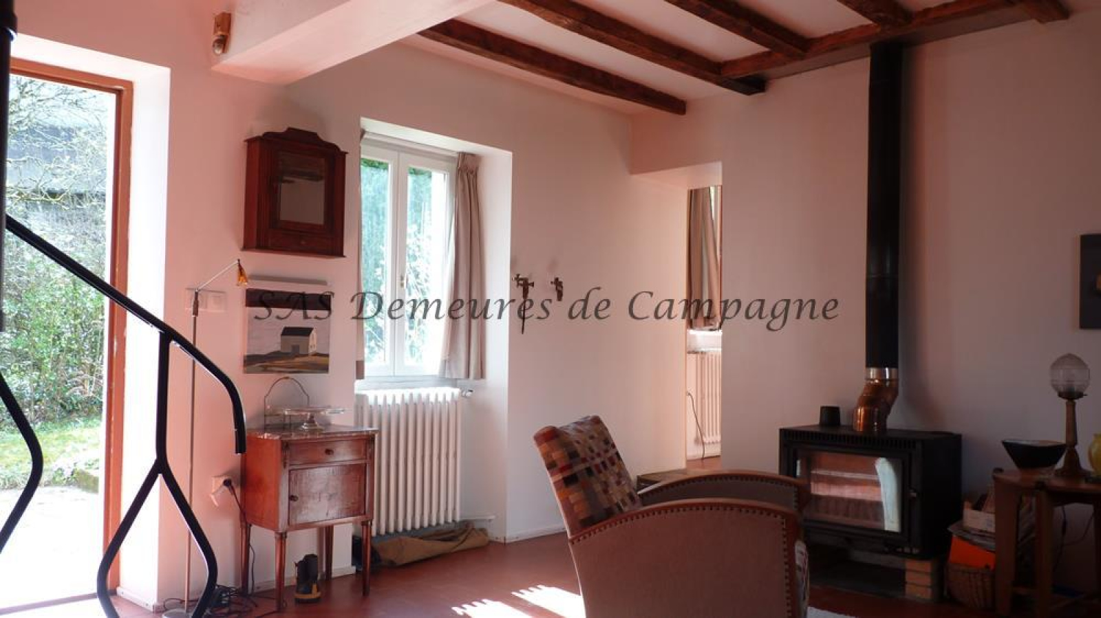 Entourée de bois et de verdure, jolie maison entièrement restaurée sur env.2500m² de jardin. De plain pied, entrée sur salon avec poêle Godin, accès cuisine aménagée, puis salle à manger ou chambre. Chacune de ces pièces bénéficie de portes-fenêtres sur l'extérieur. Un bureau et toilette indépendante complètent ce niveau. A l'étage, mansardé, palier avec chambre lumineuse. Accès à la deuxième chambre en traversant la salle de douche, toilette, une vasque.