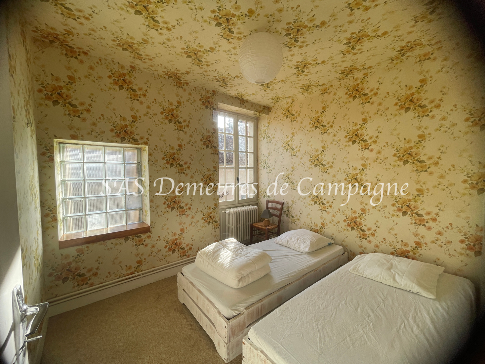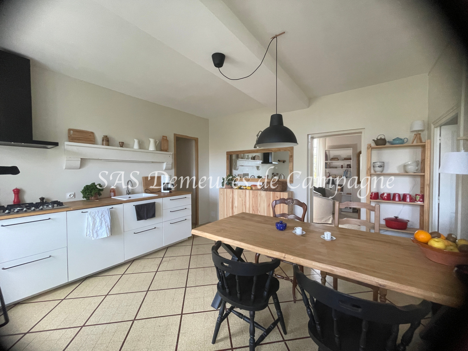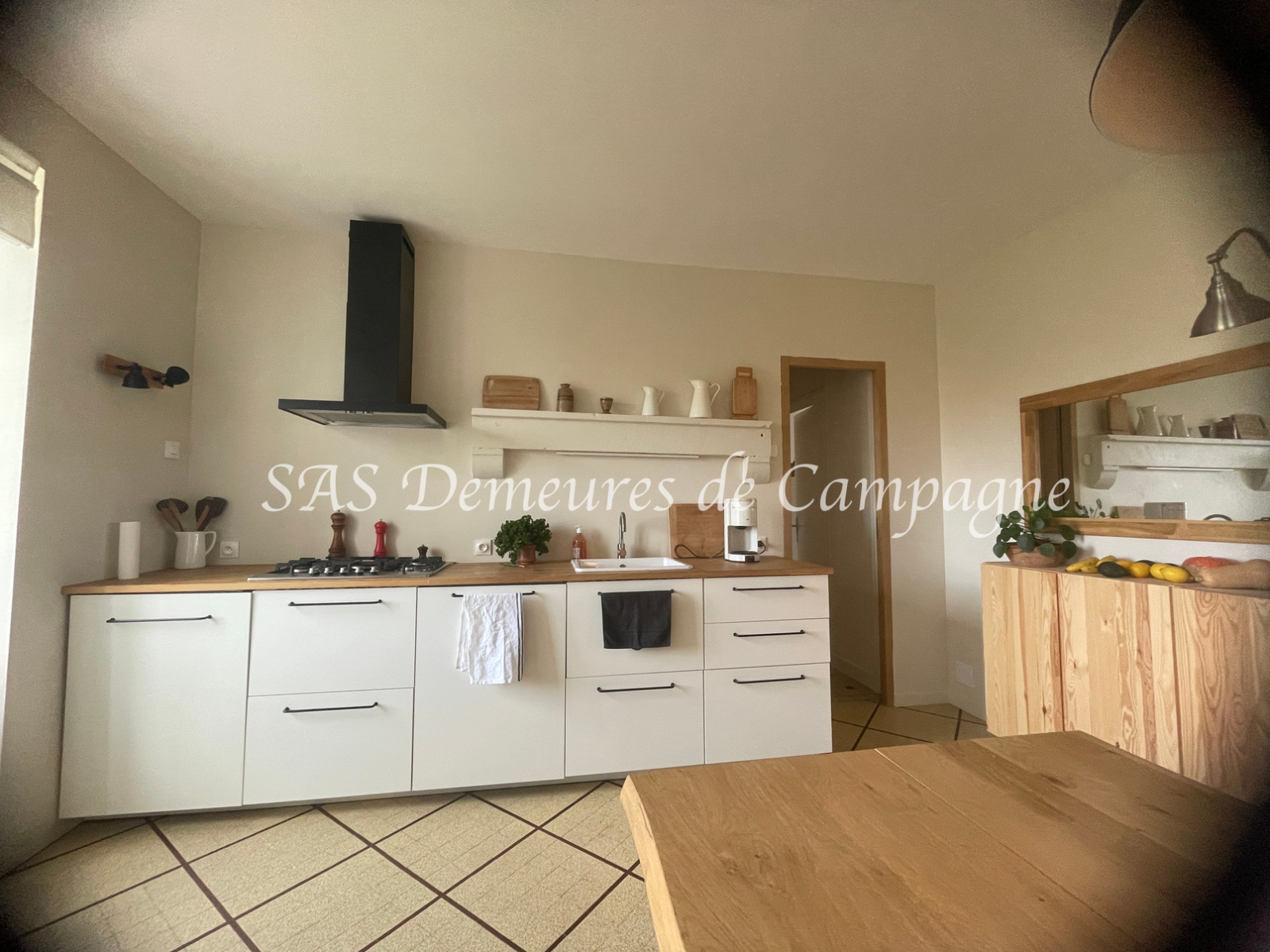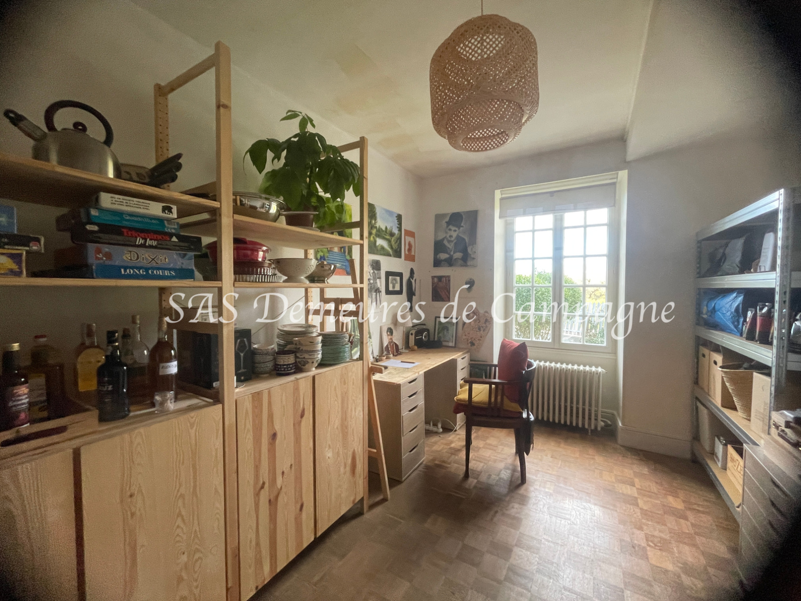 - sur l'aile gauche d'env.100m2 : entrée sur cuisine américaine rénovée en avril 2024, un salon avec cheminée insert, 2 chambres de plain pied, salle de bain et WC indépendants. A l'étage, palier ou bureau, deux chambres, salle de douches avec WC. Pour le confort, chaudière à pellets. Cave voutée en sous-sol d'env.30m2.